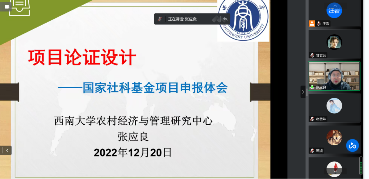 根据乡村振兴研究院2022年工作安排,并进一步提高全院教师的科研水平,12月20日下午2点,乡村振兴研究院邀请到了西南大学张应良教授通过腾讯视频为全校教师开展题为“项目论证设计——国家社科基金项目申报体会”的专题讲座。