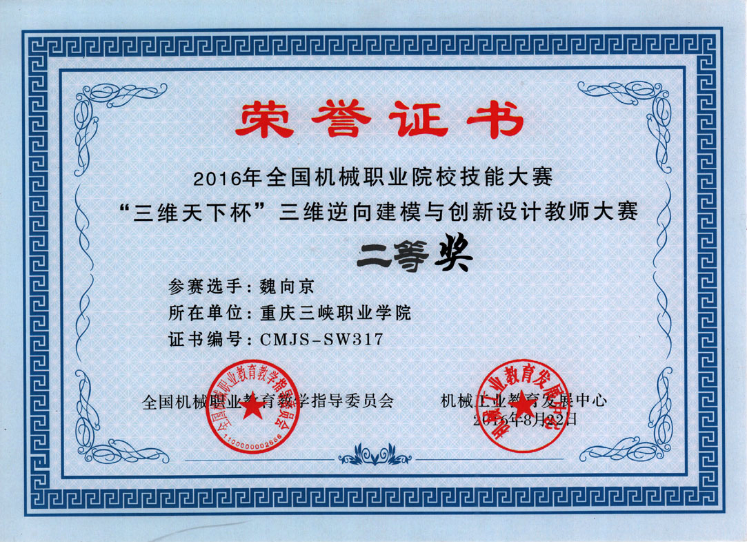 2016年全国机械职业院校技能大赛“三维天下杯”三维逆向建模与创新设计教师大赛二等奖 |