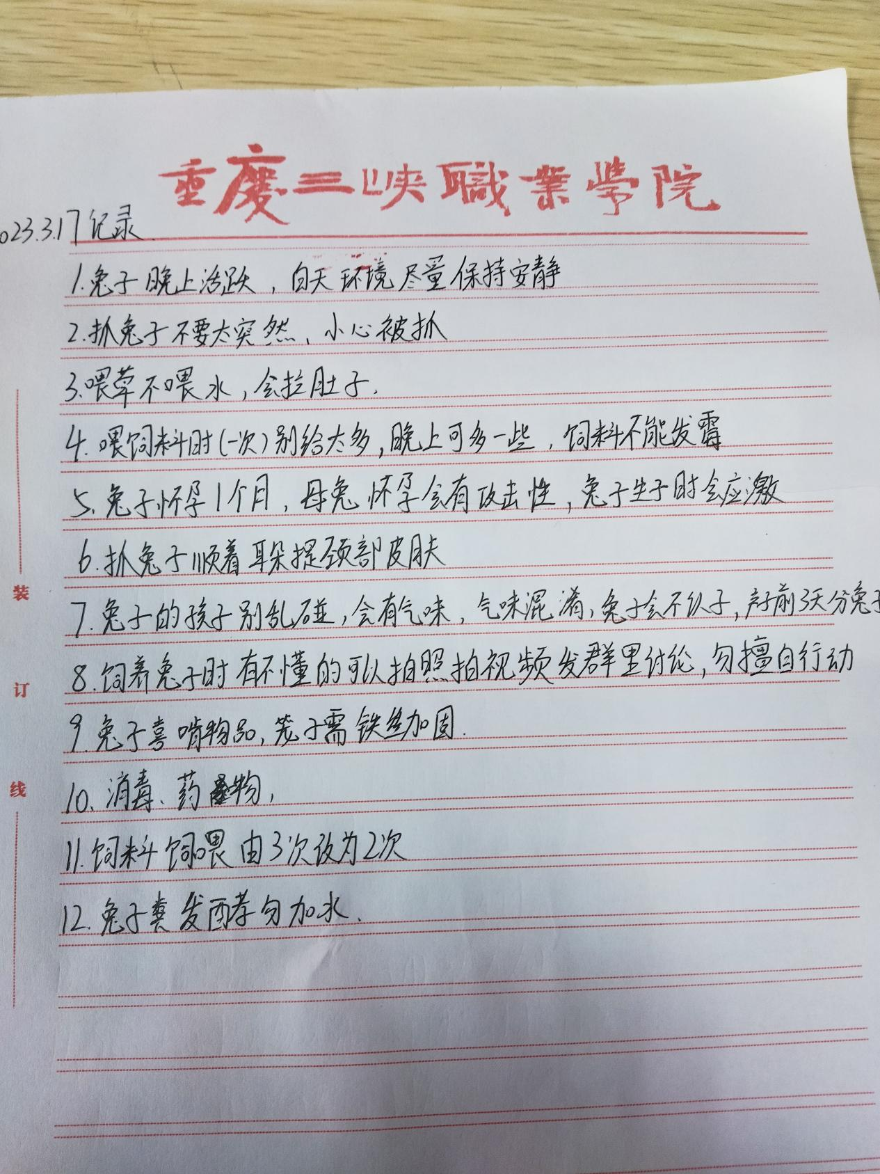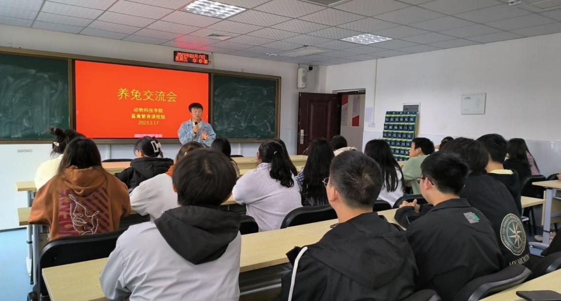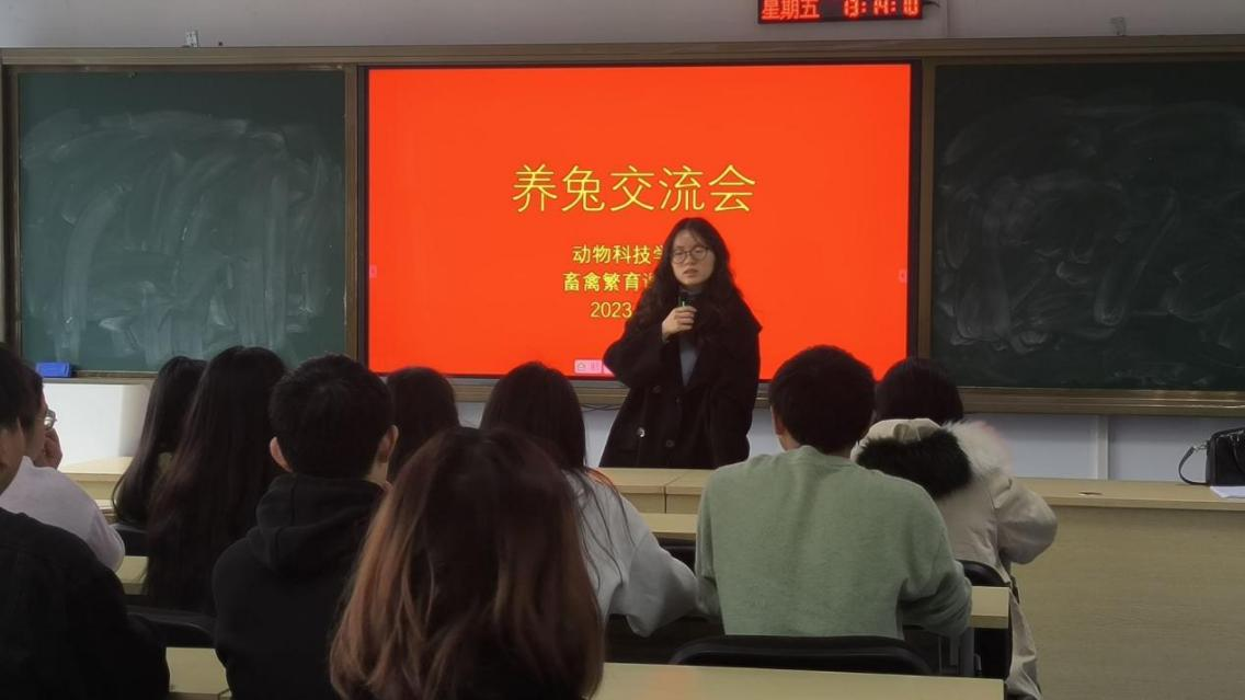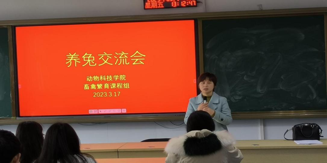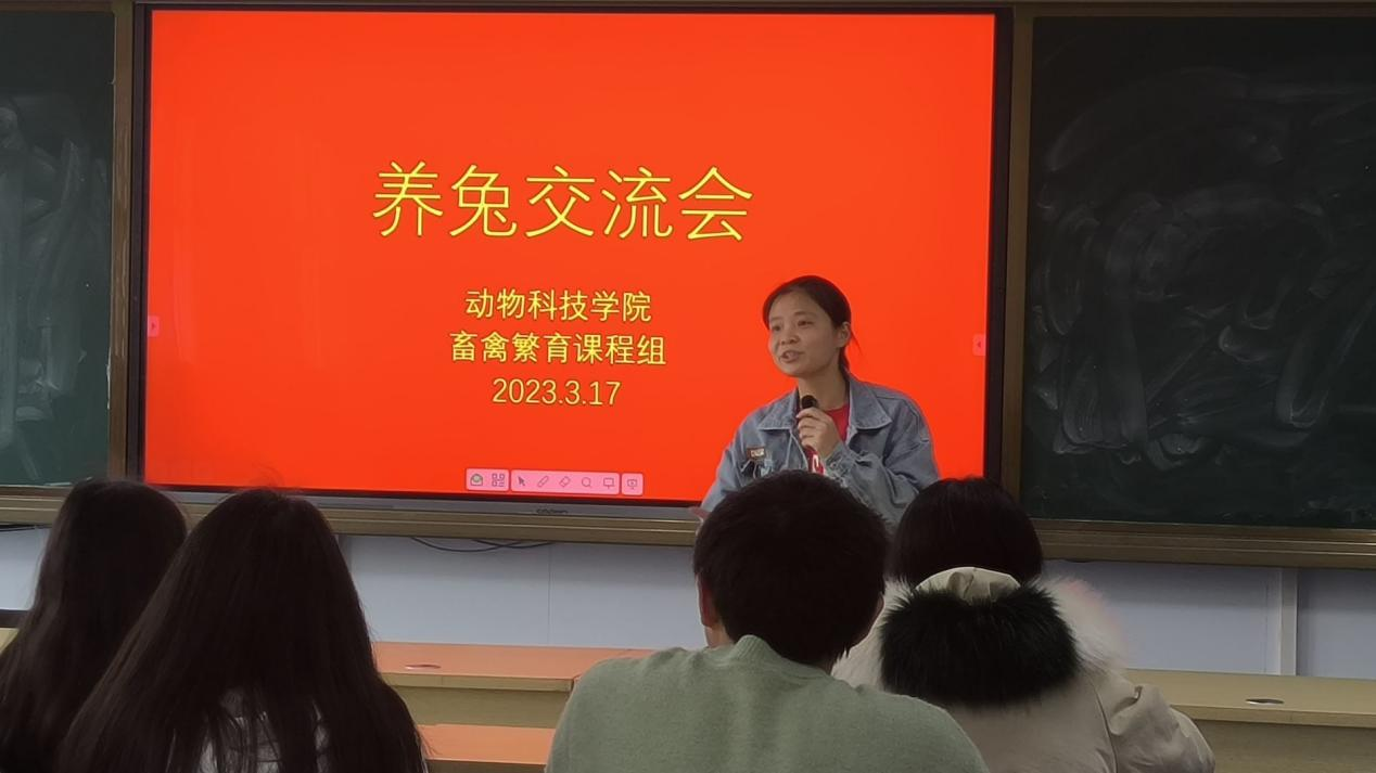 为促进畜禽繁育课程试验兔的饲养管理工作,2023年3月17号中午一点,在现代畜牧科技大楼414举行了首次养兔交流实践活动,由母治平老师主持,畜禽繁育课程组秦柔老师、喻维维老师、具有丰富养兔经验的彭玉同学以及畜牧兽医专业三四班的20多位同学参加。