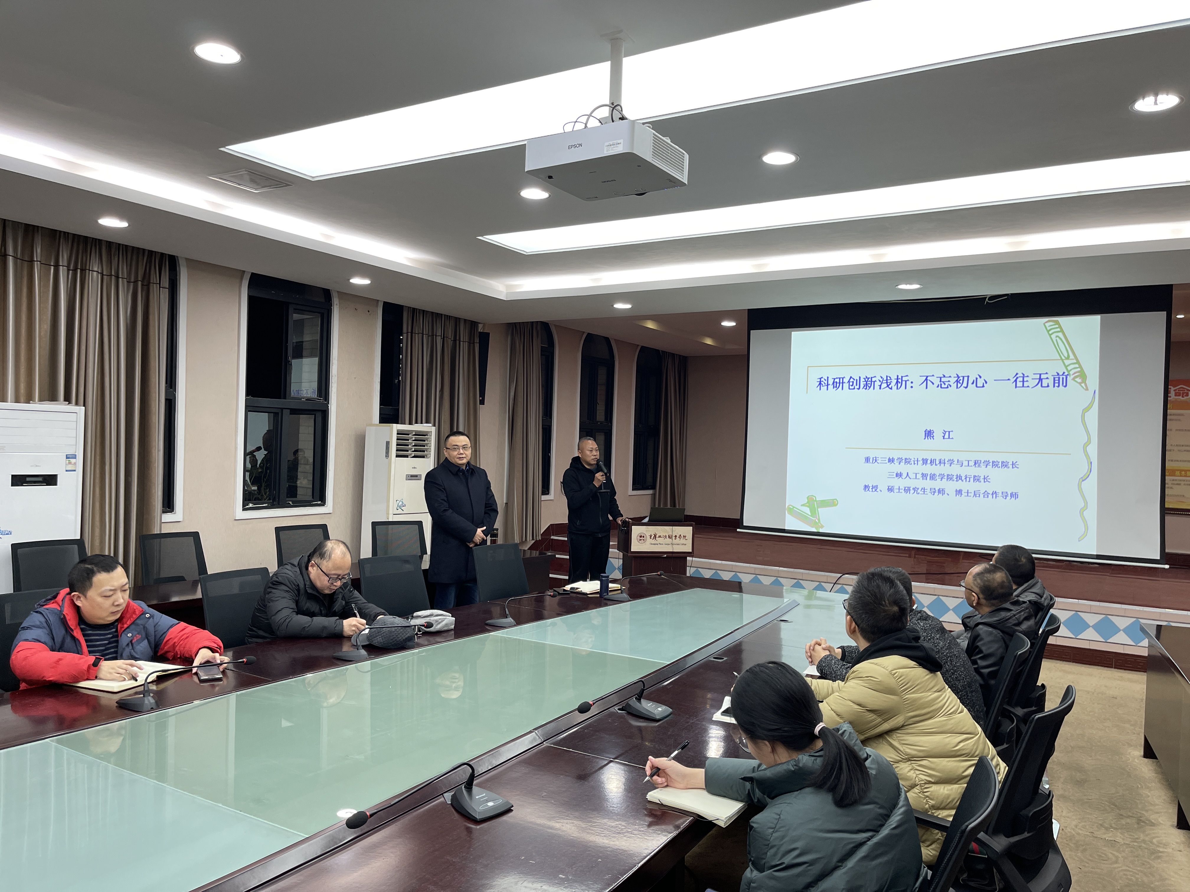 为落实人工智能学院党总支为师生办实事,进一步提升人工智能学院整体办学水平,培养专业教师的教学和科研能力,提高学生的学习积极性,高质量完成“双高计划”建设中的科研建设任务,2021年11月30日晚上,人工智能学院邀请了重庆三峡学院计算机科学与工程学院院长、三峡人工智能学院执行院长、硕士研究生导师、博士后合作导师熊江教授,举办了“科研创新浅析:不忘初心 一往无前”专题讲座,人工智能学院全体教师参加了培训。