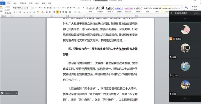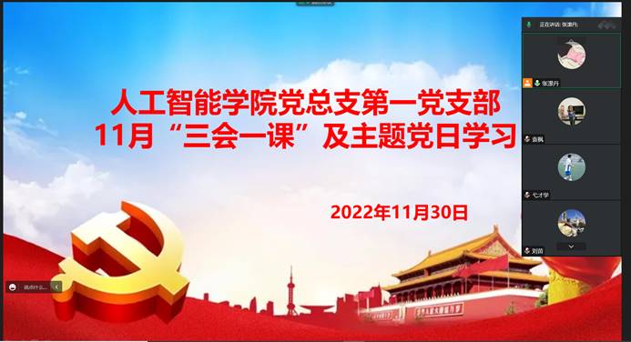为深入落实“三会一课”制度,扎实开展主题党日学习教育。2022年11月30日,受新冠疫情影响,人工智能学院党总支第一党支部通过线上腾讯会议的方式开展了11月“三会一课”及主题党日学习。