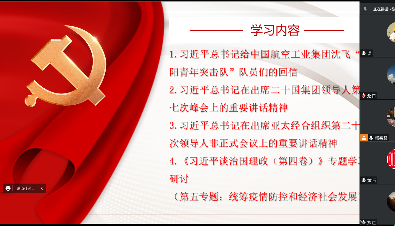 12月31日下午,智能制造学院党总支通过线上方式开展了12月“三会一课”和主题党日活动。会议由智能制造学院党总支书记熊江主持,党总支5名支委参加了学习。会议集中学习了习近平总书记给中国航空工业集团沈飞“罗阳青年突击队”队员们的回信、习近平总书记在出席二十国集团领导人第十七次峰会上的重要讲话精神、习近平总书记在出席亚太经合组织第二十九次领导人非正式会议上的重要讲话精神和《习近平谈治国理政》(第四卷)第... [查看更多]2023年01月03日 -